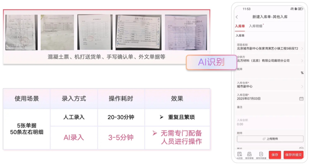 大量手寫(xiě)確認(rèn)單、混凝土票據(jù)、支出合同、機(jī)打送貨單和辦公登記表的錄入任務(wù),不管是在出差途中或辦公場(chǎng)景中,員工只需將紙質(zhì)單據(jù)拍照上傳,即可實(shí)現(xiàn)一鍵識(shí)別與系統(tǒng)自動(dòng)錄入,徹底擺脫繁瑣工作、減少重復(fù)勞動(dòng)。